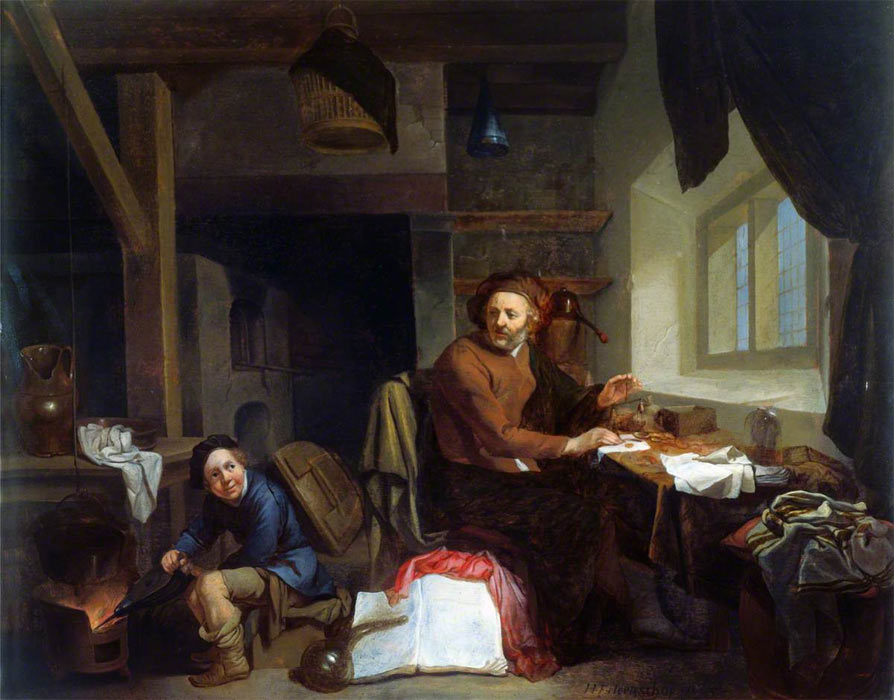 A Lady Visiting an Alchemist's Laboratory, by Jan Josef Horemans the elder (1682–1752) The stuffed fish on the wall points to an apothecary. An alchemist is in his typical posture of using a bellows to fan the fire. He has several assistant around him. The lady is of aristocratic rank, and is probably there to obtain an alchemically prepared medicine.