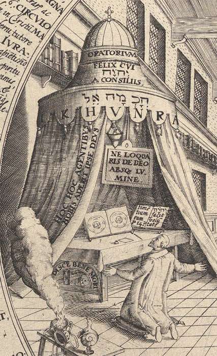 The Amphitheatrum Sapientiae Aeternae, or Amphitheater of Eternal Wisdom, is Khunrath's most famous work, and deals with the mystical aspects of alchemy. Heinrich Khunrath was a theosophist, cabalist, and a Hermetic mystic. This work illustrates the many-staged and intricate path to spiritual perfection. This engraving contains many clues to the hermetic work of alchemy, and it is worth while to go a little deeper into the secrets displayed by the author. At the top of the tent, is written Oratorium, underneath 'Felix cui a consilus' , with the Hebrew name for God, IHVH. In this engraving we see the alchemist kneeling and spreading out his arms in the hope of receiving divine revelation. In front of him, a sign is hanging up with the text Ne loquaris de Deo absque lumine (Do not speak of God without the Light). On the table inside the oratory there are two open books, in one you can see two pentacles, in the other you can read the words "timentium", "YHWH", "voluntate" and "P.145". It is verse 19 of Psalm 145 (psalmus in Latin): "God will do the will of those who fear him, and he will answer their prayers, and he will save them". In addition to establishing the need for prayer as an operational means, this verse leads back to the writing on the first of the three steps that are necessary to enter the Temple according to the ABC of the Rosicrucians: on it is in fact engraved "Timor Domini" (have fear of God). Under the oratory table there is a skull and an hourglass surmounted by the words Disce bene mori (Learn to die well). This sentence has two meanings: the first is that time passes quickly and it is necessary not to waste it if you want to reach the end of life. Make sure that you have obtained a minimum of continuity of consciousness that can allow you to pass unscathed through the abyss of death. The second is linked to the practice necessary to reach the initiatory death while alive. Although the alchemist's temple displays some minor alchemical apparatus, and some glass vessels, his altar is the most important aspect. The oratory (left) is opposite the laboratory (right). On one of the wooden architrave beams of the ceiling is the inscription Sine afflatu divino nemo unquam vir magnus (Without divine inspiration no man (was) ever great). Below there is a chandelier in the shape of a star with seven rays, symbolizing the seven alchemical operations. Also notice the table with musical instruments, referring to the art of music, and the importance of harmony. A balance on the table refers to need for equilibrium. Next to the table you can see three appliances: the Maturandum, which is used for cooking in a bain-marie; the Festina-Lente (Hurry slowly), which is used for slow cooking, and a still on which you can read Ama et Spt (Soul and Spirit) from which smoke comes out. On the side panel of the roof of the laboratory we read Sapienter retentatum, succedet aliquando (Trying again wisely, in the end we arrive). It means that we should never give up. On the left side, on the drapery is written: Hoc Hoc agentibus nobis, aderit ipse Deus (When we attend strictly to our work, God himself will help us). The bottom of the two pillars to the right: Ratio (Reason) and Experientia (Experience). Above the inscription Laboratorium you can see a rooster overhanging a helmet under which there is a triangular plaque on which the symbol of Salt ( astar) is drawn. The rooster with its song heralds the advent of the light of the sun that illuminates it, and is therefore a prelude to the achievement of the work. Higher still we read Nec timere nec timide (neither with fear nor cautiously). Near the first column you can see the bellows which, with its breath, is an essential tool for feeding the alchemical fire. On the bucket full of coal we read: Ne pudeat carbonum (do not be ashamed of the remains of combustion). We often find a reference to not throwing away the dross or ashes that remain at the bottom of the vessel, a refrence to the physical, animal body that we still need to be alive and be able to perform the Great Work. Over the doorway in the back is written Dormiens vigila (While sleeping, watch). The door leads to another room with a bed. This is a reference to always be aware. On the top of the roof of the laboratory, and on the shelves, are stills, two tetractys formed by weights. The vessels on the shelves have labels with signs and names of alchemical substances. The tetractys is primarily a Pythagorean symbol, that is associated with planetary motions and music.