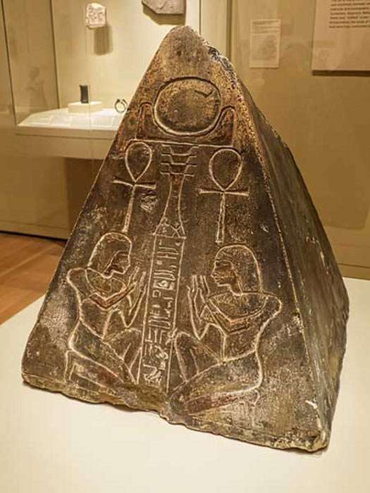 Pyramidion of Hori, from Abu Tig, Egypt, 1350 B.C. The Sun sits on the symbol of Earth, and atop the Djed pillar. |