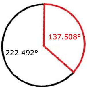 Algebraic the golden ratio is expressed as (1+√5)/2. The golden ration appears in geometric structures and also in patterns in nature. When you apply this ratio to the angles of a circle you obtain the Golden Angle. When two angles that make a full circle have measures in the golden ratio, the smaller is called the golden angle, with measure g = 137.508° a = 222.492° b = 137.508° a/b = 222.492/137.508 = 1.618