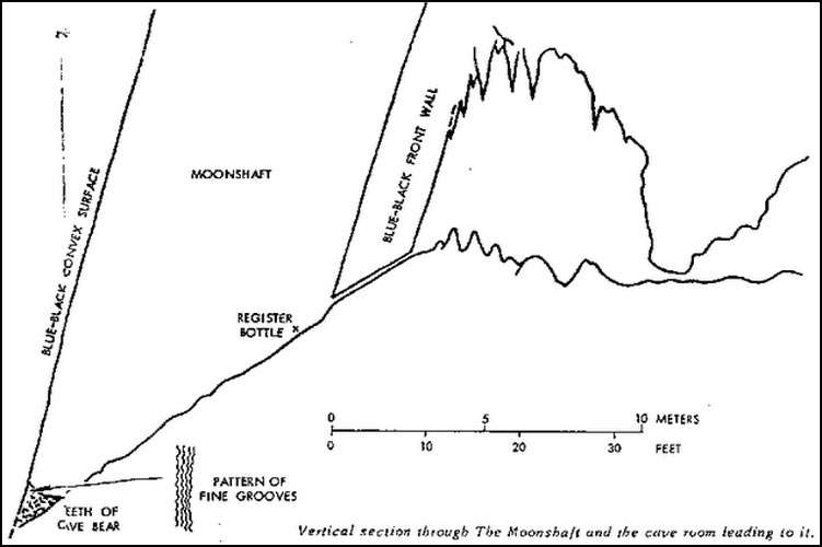 Saturday afternoon the remnants of our battalion (184 men and officers, a quarter wounded, 16 stretcher cases) were retreating through the snow of the north slope. My company was the rear guard. At dawn Sunday, the two 70 mm guns opened up at us from close range - about 300 m. Having held our position for 12 hours, I ordered a gradual breakup of the skirmish and slip-off. But in our left trench someone became careless, and that drew 2 direct hits - shells, two wounded. Arriving there I bumped into the enemy, caught a bayonet and bullet with my left palm and blow on my head, which put me out. Without my fur cap it might be fractured. I came to when someone was pulling me from the trench, a tall peasant. He packed snow on my hand, and grinned. Then this rough and ready Samaritan grabbed Jurek, stripped off his pants, yanked the long sliver of steel from his thigh, and planted him bare-bottomed and gasping into a heap of snow. Martin, with a slash across and into his belly was tenderly bandaged. Building a stretcher the peasant introduced himself as Slavek, a sheepman, owner of the pastures hereabouts. With Slavek hauling and guiding, it took us four hours to reach this cranny. Slavek moved rocks in the cranny and opened a cleft, the entrance to this roomy grotto. Placing Martin in the niche, we were astonished to see Slavek become ceremonious: he crossed himself, each of us, the grotto, and, with a deep bow, its back wall, where a hole came to my attention. About to leave us, Slavek went through the same holy rites, and begged me not to go further into his cave. I accompanied him to fetch pine boughs, and he told me that only once, with his father and grandfather, had he been in this cave; that it is a huge maze, full of pits which they never wanted to fathom, pockets of poisonous air, and "certainly haunted". I was back in the grotto with my men at about midnight, exhausted, head very painful, soothed it with snow. Martin was unconscious, Jurek feverish. For breakfast-lunch-dinner he and I had hot water, and, thank God, I had my pipe. I placed warm stones around Martin, and Jurek got the first watch. Miserable night. Martin at time conscious; I gave him 3 aspirins and hot water to sip with drops of Slivovitz. Jurek hobbled hungrily around the two German helmets in which he boiled water to which I added 10 drops of Slivovitz, our breakfast. With this deluge of snow, avalanches imminent, and enemy skiers roaming, Slavek may not be able to get through to us with food for days to come. And neither should I try hunting and track up the landscape while I have two immobilized men on my hands. But here we have this cave which Slavek knows only partially; it may have more than this known entrance, and it may contain hibernating animals. These possibilities I mulled over while Jurek was chewing pine bark, and, as expected, he implored me to go poaching into Slavek's cave and promised to keep mum. And I was not only starved but equally eager to find out what makes self assured Slavek scared enough to invoke the Deities. I started my cave tour with rifle, lantern, torches, pick. After a not too devious nor dangerous walk and some squeezings, always taking the easiest and marking side passages, I came, after about 1 1/2 hours, into a long, level passage, and its end upon a barrel-sized hole. Crawling through and still kneeling, I froze in amazement - there stands something like a large, black silo, framed in white. Regaining breath I thought that this is a bizarre, natural wall or curtain of black salt, or ice, or lava. But I became perplexed, then awestruck when I saw it is a glass-smooth flank of seemingly man-made structure which reaches into the rocks on all sides. Beautifully, cylindrically curved it indicates a huge body with a diameter of about 25 meters. Where this structure and the rocks meet, large stalagmites and stalactites form that glittering white frame. The wall is uniformly blue-blackish, its material seems to combine properties of steel, flint, rubber - the pick made no marks and bounced off vigorously. Even the thought of a tower-sized artifact; embedded in rock in the middle of an obscure mountain, in a wild region where not even legend knows about ruins, mining, industry; overgrown with age-old cave deposits, is bewildering - the fact is appalling. |