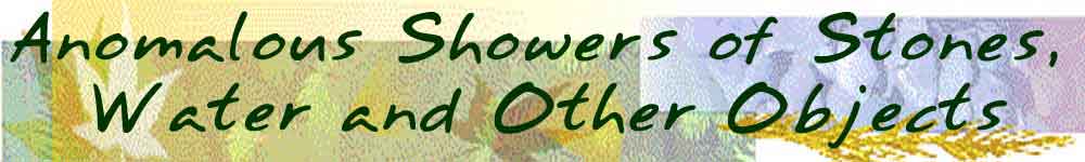 2. Accounts of Anomalous Showers The shower phenomenon is often seen as a mystery. Sometimes it is attributed to supposed psychic powers of children. Sometimes it is blamed on supposed ghosts or spirits. A small minority of the cases are label poltergeist. Although they are all the same phenomena, sharing the same characteristics, I have divided the reports I found into sub-chapters, depending on the main focus: It's Raining Stones! Money Showers Water or Rain Out Of Nowhere Other Substances (links to these sub-chapters are at top of this page) In these sub-chapters I have collected the original newspaper, magazine and other reports. When I first looked around on the World Wide Web, I found a lot of websites that list a small amounts of the showers often without any reference. They copied it from other websites who copied it from.... Later I found that they contained a lot of mistakes. You really have to go back to the original article, and this was not always easy to find. The famous Charles Fort (1874-1923) wrote a lot about these phenomena, but he summarized them, or quoted a few sentences. He brought awareness to these anomalous phenomena but he didn't want to investigate it. He left out a lot of details. It took me a long time to look up all the reports you find in the different chapters. Most of them I found on websites who have historical newspapers digitized and searchable. Their search function is not always adequate because the newspapers are scanned as image files, with accompanying text files, which are the result of electronic 'translation' into text characters. This gives a lot of mistakes in the text when he newspaper image file is of poor quality. I am sure that there are more cases buried in these newspaper collections. In the beginning I thought there were only a small number of these 'showers', the ones that are repeated over and over again in books and websites. When I looked up the original reports of these, and looking through the digitized historical newspapers and magazines, I kept on finding more and more. Many cases have never been mentioned anywhere else. Considering that I have limited myself primarily to public domain American and Australian newspapers from before the passing of copyright law (before 1923 in the USA and before 1955 in Australia), the number of anomalous showers over the past two centuries must be far greater than what I have collected. The USA and Australia are only a small fraction of the surface of this planet. I am convinced that the these showers are not a rare event at all. If one happens in your town, it can be called rare event, because it probably won't happen again in your lifetime. But on a global scale, they happen frequently. I think a lot of them don't even get noticed because they happen outside in the woods or plains where nobody lives. In rare cases stone showers were seen in open fields when farmers were working in those fields. |
