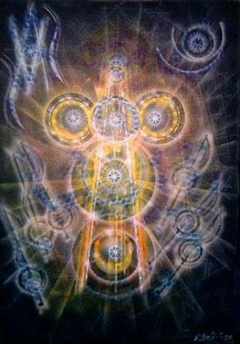 Paintings on canvas and paper by the Hungarian shaman Joska Soos, depicting light-sound beings, as directly perceived by his inner vision. Here are various light-sound beings who presented themselves to him. These are spiritual beings who create the universe in its many aspects, from very little things to immense galaxies. These beings are not always easily to name, as they just showed up without any further explanation. Sometimes they were clearly associated with particular subjects, and are thus labeled in relation to that subject. They are from various origins. |