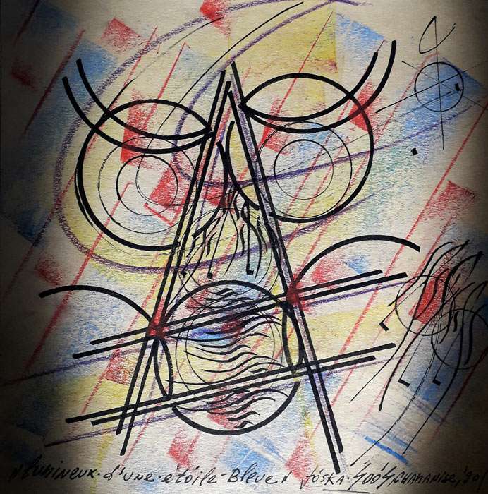 Paintings on canvas and paper by the Hungarian shaman Joska Soos, depicting light-sound beings, as directly perceived by his inner vision. Here are various light-sound beings who presented themselves to him. These are spiritual beings who create the universe in its many aspects, from very little things to immense galaxies. These beings are not always easily to name, as they just showed up without any further explanation. Sometimes they were clearly associated with particular subjects, and are thus labeled in relation to that subject. They are from various origins. In his drawings, black lines represents brilliant white light. |