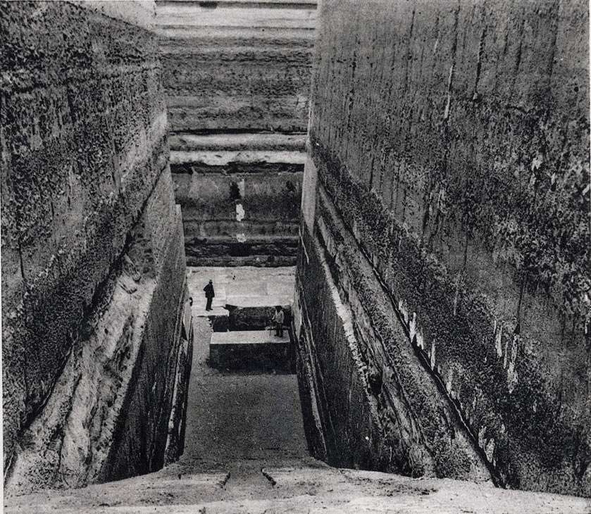 When clearing the descending corridor Barsanti found at the bottom end a strange construction made from granite blocks: "Right at this point we encountered a large block of granite weighing about thirty tons, which was placed horizontally on the surface of other blocks which seemed to form the pavement of the pit. At first I imagined that I was standing in front of the gate of the monument, but descending still lower, I met two other blocks of the same or similar size, which were placed side by side, then below two blocks, also of granite, and 1 meter 6 centimeters thick, but placed on the same rock." Large granite blocks of 30 tons! It becomes really obvious here that whoever made them had no problem transporting these heavy stones, let alone bringing them down here and placing them around. Barsanti also got the first impression that the floor of the chamber behind it was also made of granite blocks. |