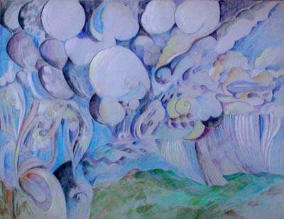 A variety of images: landscapes, dream worlds, visionary and magical, surfing the cosmic wave, a guardian angel, tree spirits, nature spirits, moonrise over Santa Fe, mystical portraits.